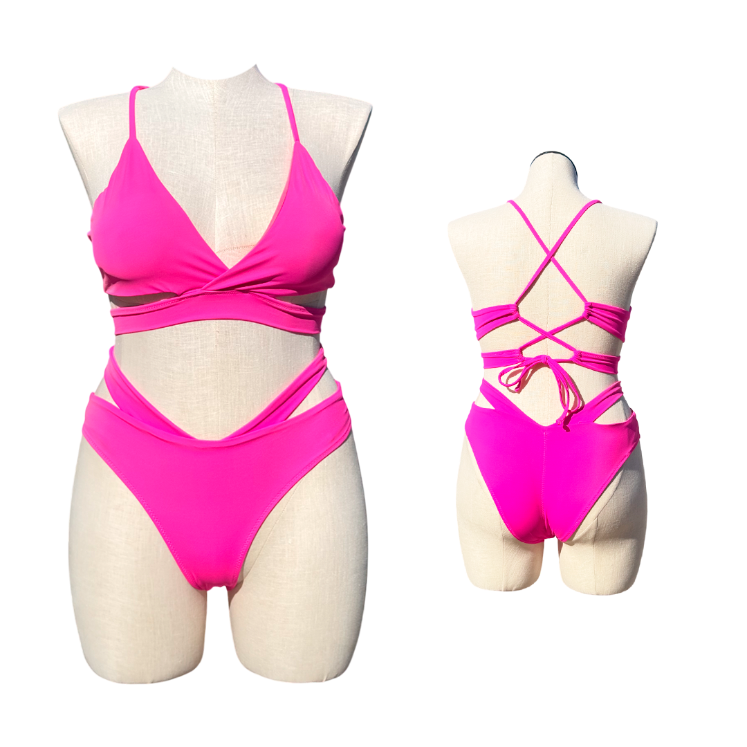 A two-piece neon pink swimsuit: fun, flirty, and full of personality. The vibrant shade of neon pink radiates energy and confidence, making a bold statement wherever you go. This swimsuit features a stylish bikini top and bottom, perfect for showcasing your curves and enjoying a day at the beach or by the pool. Whether you're lounging in the sun or taking a dip in the water, this neon pink ensemble is sure to turn heads and make you feel fabulous all day long.