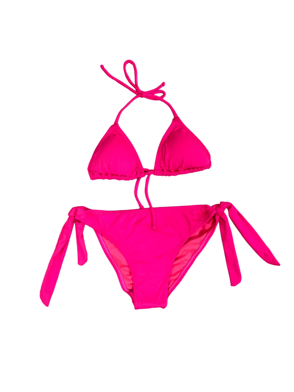A two-piece neon pink swimsuit: vibrant, eye-catching, and full of energy. The intense hue of neon pink commands attention, making a bold statement wherever you go. This swimsuit features a classic bikini top and bottom, designed to accentuate your curves and create a playful yet stylish look. Whether you're soaking up the sun or diving into the waves, this neon pink ensemble is guaranteed to turn heads and keep you feeling fabulous all day long.